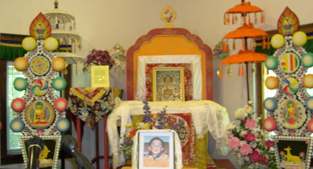 two traditional chortens (spiritual structures), a teaching pavilion, four retreat cottages, two private residences and the Kumbum Chamtse Ling Monastery. Within this two-story building, we entered a shrine room where a large Buddha was flanked on either side by four statues of bodhisattvas
