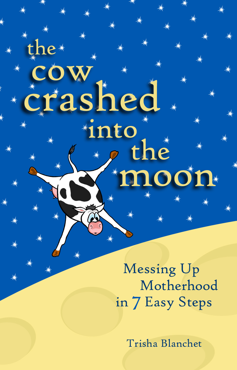 But moms do need a break. Something quick and fun. Something we can pick up when Junior disappears to use the potty. Readers of Trisha Blanchet’s award-winning humor column get that break every weekend with a cup of coffee and the Sunday paper. The Cow Crashed into the Moon gathers all the fan favorites (along with lots of new and reliably warped insights) into one convenient package… perfect for fast reads in the laundry room. Or the bathroom. Or the closet. Or wherever you go when you’re feeling tempted to leave the kids out on the front lawn in a box marked “free to good home.”