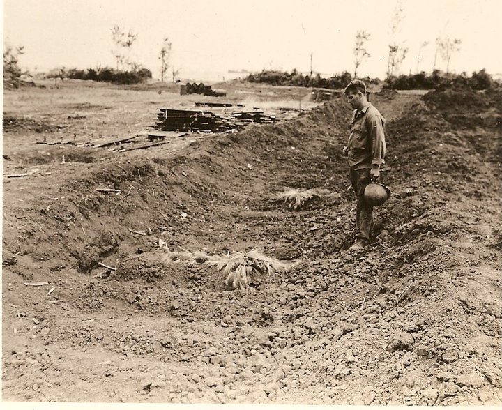A historic picture of the original grave site of Ernie Pyle, famous World War II columnist and news journalist, surfaced recently on Facebook. It shows a long trench-like grave site where Pyle was originally laid to rest among other fallen soldiers. An unidentified soldier pays final respects in a place as simple and honest as Pyle’s writing and as bleak as death itself.
