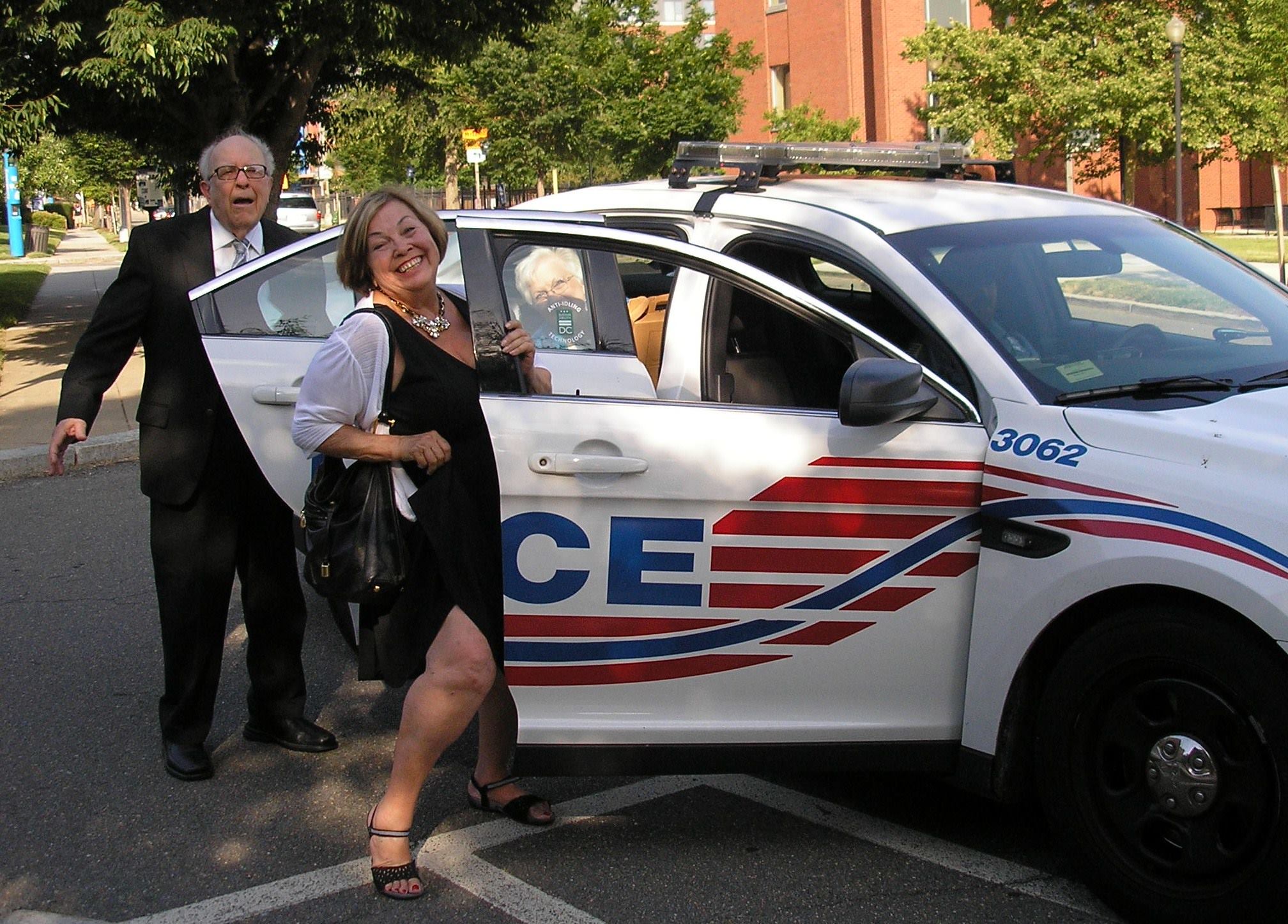 Howard University police pick up NSNC members Bob Haught and Joani Foster … to give them a ride to the student union, June 28, 2014. Mary Haught already is in the cruiser. Cynthia Borris photo